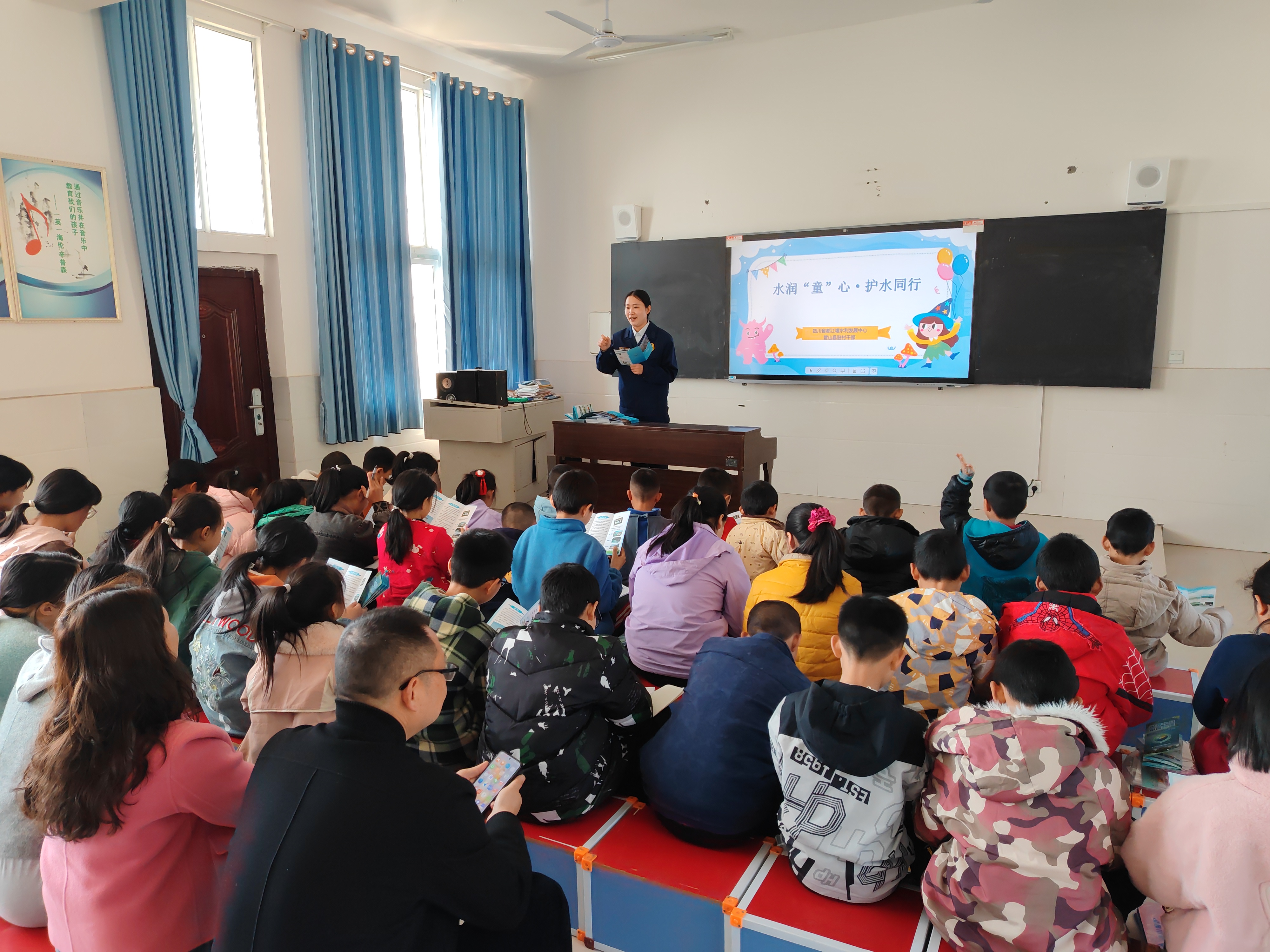 中国水周期间,人民渠第二管理处联合地方政府、检察院、水利局等部门采取搭建宣传点+走乡串户的方式开展6场进乡村(乡村学校)主题宣传活动。宣传点通过悬挂横幅、设立咨询台、发放宣传手册、现场答疑等方式,向群众普及《中华人民共和国黄河保护法》《中华人民共和国长江保护法》《四川省水资源管理条例》《四川省河湖长制条例》《四川省都江堰水利工程管理条例》等法律法规;普法志愿者针对农村实际,深入田间地头用方言讲解“节水护水”“水利工程保护”“农村饮用水安全”等与群众生产生活密切相关的案例,以通俗易懂形式向群众普及水资源保护知识,强化“节水、爱水、惜水、护水”意识。同时,四川省都江堰水利发展中心营山县望龙湖镇驻村干部,依托都江堰水利工程国家水情教育基地优势,将行业特色与乡村教育融合,深入帮扶村学校开展水情教育活动,通过生动有趣的课堂讲解、科普宣传等,为乡村教育注入新的活力,也在孩子们心中播下人水和谐的种子。