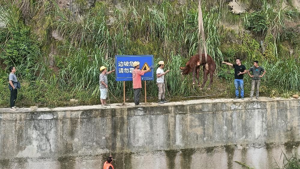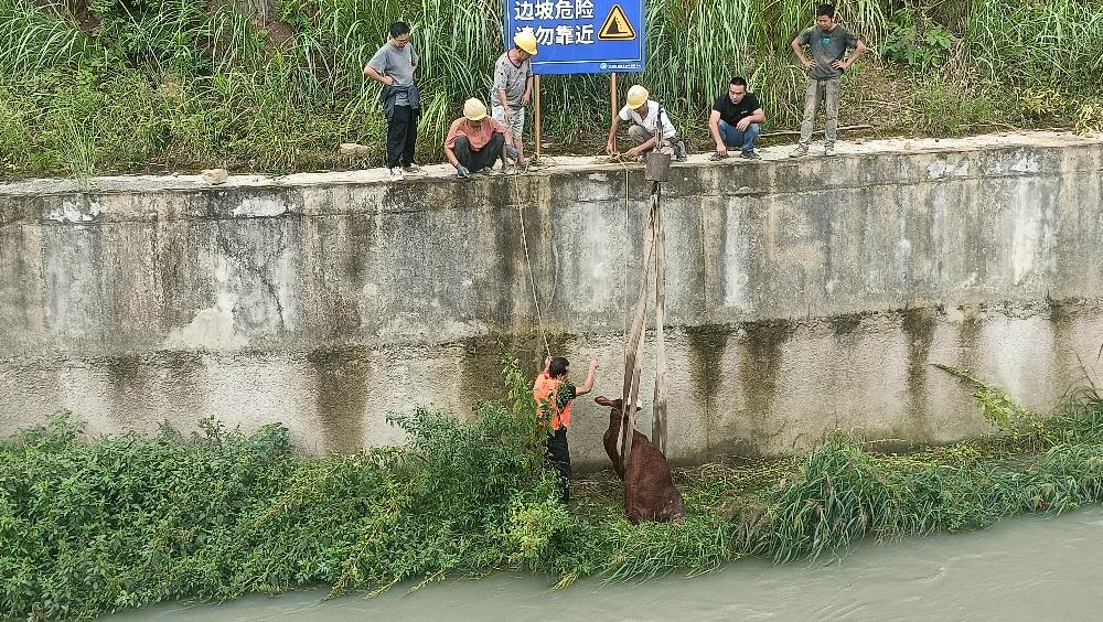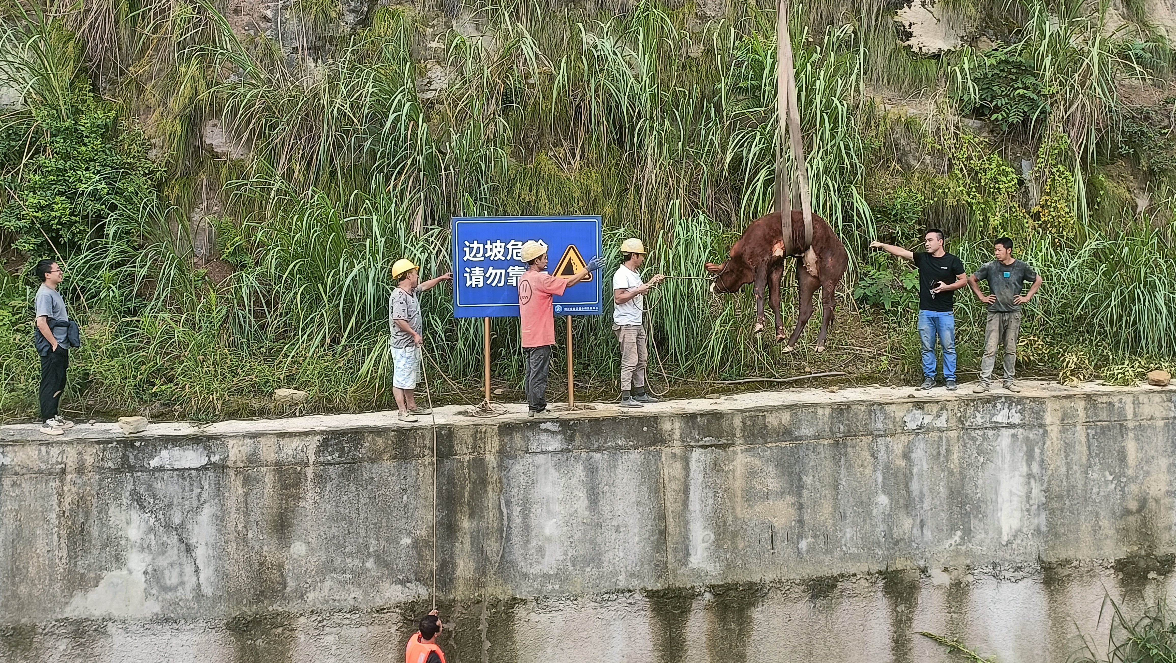 经多方协同努力,小牛被安全顺利解救上岸。同时施工方得知村民曾金武身患尿毒症多年,经济困难,主动免除全部打捞及协助费用。