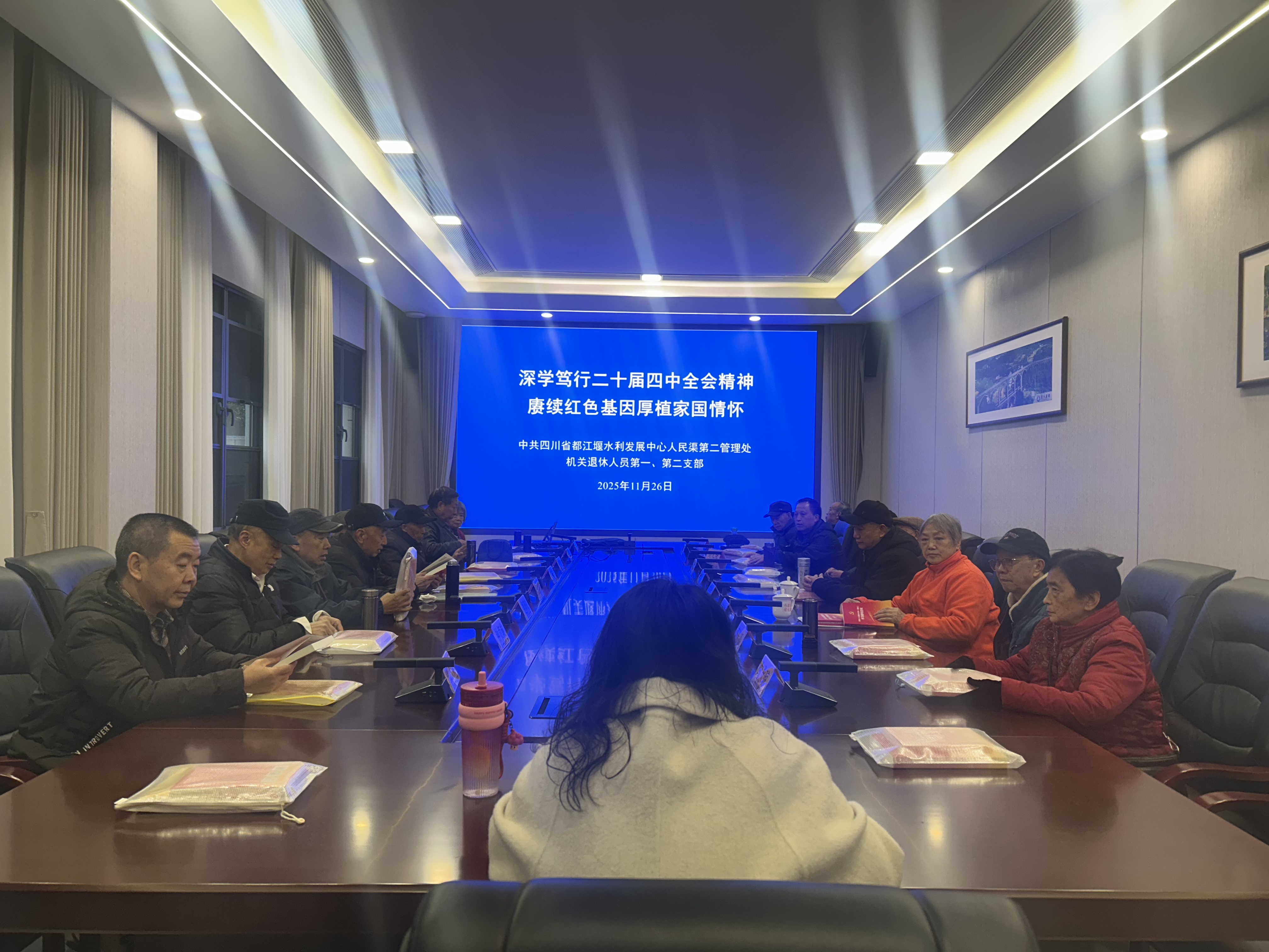 为深入学习贯彻党的二十届四中全会精神,引导退休党员筑牢思想根基、传承红色血脉,进一步增强党组织的凝聚力和战斗力。2025年11月26日,人民渠第二管理处机关退休人员第一、二支部精心组织“深学笃行二十届四中全会精神 赓续红色基因厚植家国情怀”主题党日活动,20余名退休党员齐聚一堂,共学精神、共忆初心。