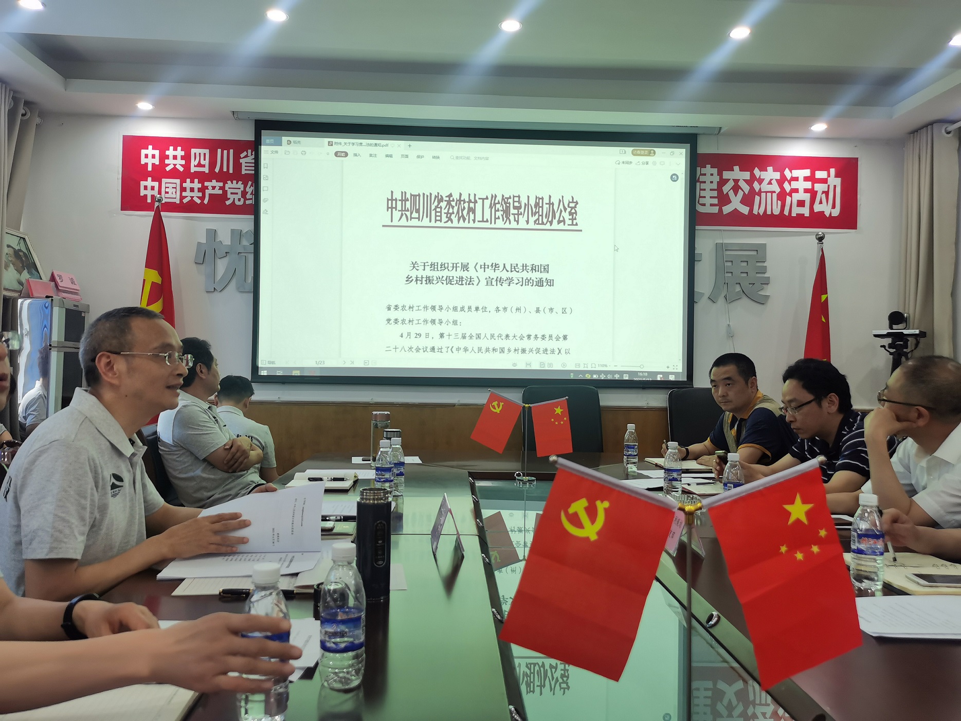 会议开始,杨奎书记和水利设计院门立军书记就参会党员及各自单位情况进行介绍。因两家单位性质大体相同,且都处于企业改制时期,随后双方从企业党建、企业管理、企业公司化改制、设计与施工业务协作配合等进行了深入交流,随后,杨奎书记和全体党员一起学习了《中华人民共和国乡村振兴促进法》。