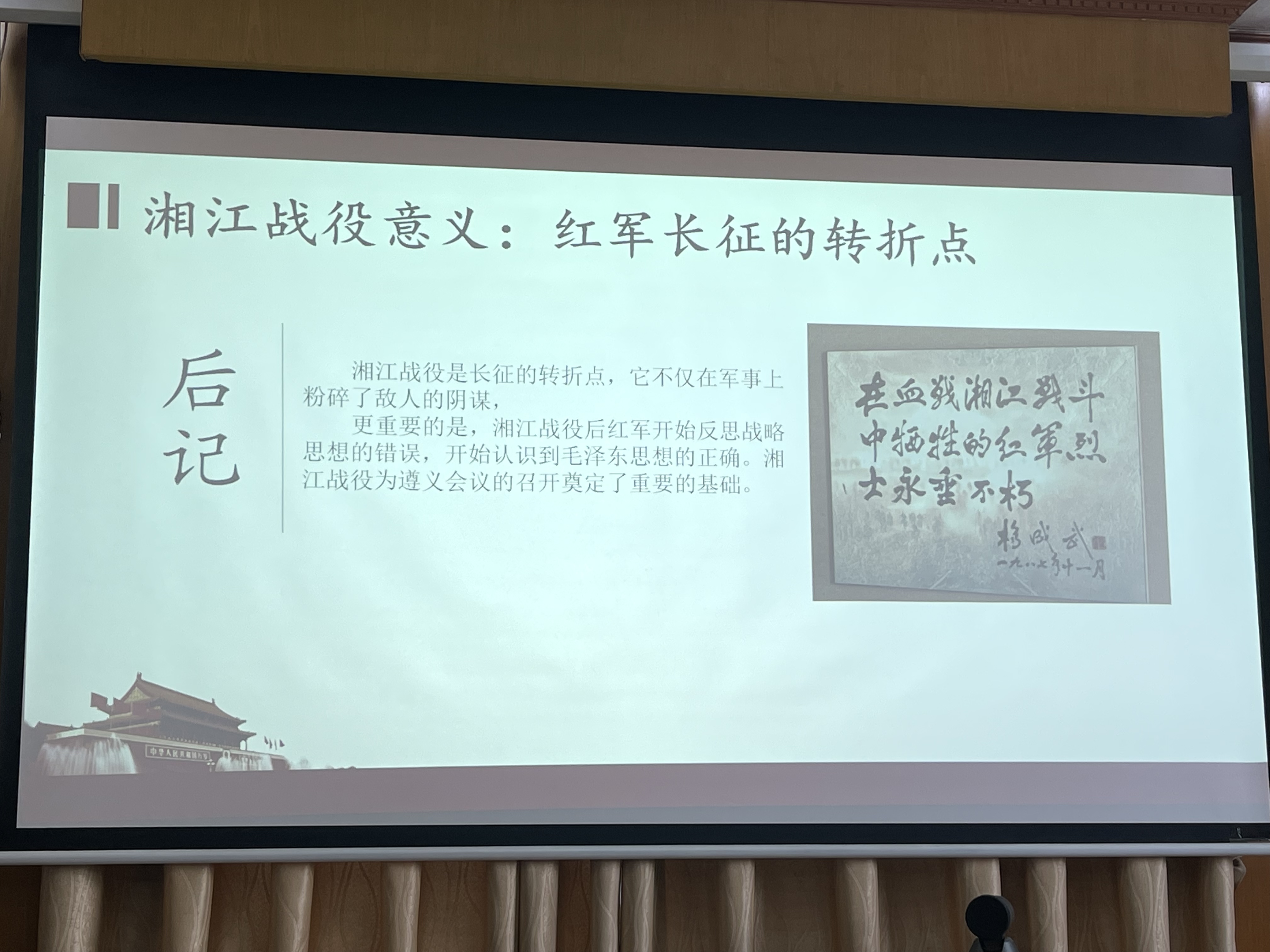 处级干部范云伟同志为参会党员讲授了“湘江精神”党课。让支部党员的深入了解学习湘江战役的全过程。全面深刻理解其历史意义:它是长征的转折点,它不仅在军事上粉碎了敌人的阴谋,更重要的是,湘江战役后红军开始反思战略思想的错误,开始认识到毛泽东思想的正确,为遵义会议的召开奠定了重要的基础。它的精神将永远激励人们奋发图强、开拓进取。