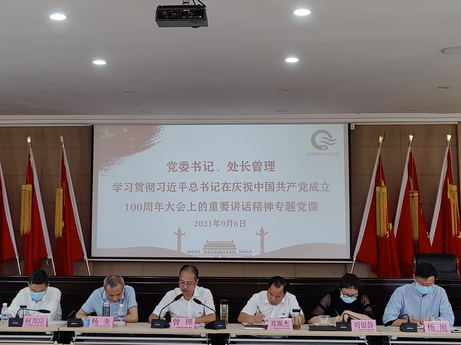 曾理书记就学习贯彻习近平总书记在庆祝中国共产党成立100周年大会上的重要讲话精神向与会人员作了专题党课宣讲。党课紧紧围绕习近平总书记“七一”重要讲话精神主线,深刻阐释了伟大建党精神的丰富内涵,结合人民渠第二管理处实际,激励全处党员干部职工要坚定理想信念,争做对党忠诚先锋,锤炼“敢想敢干敢成”的精神,为发展下苦功,为百姓尽心力,为工作多流汗。争做锐意开拓进取先锋,增强“善想善干善成”的本领,在新征程上体现新担当,焕发新气象,彰显新作为。坚持实事求是、因地制宜,要提升驾驭全局能力,善于“十指弹钢琴”,准确把握主要矛盾和矛盾的主要方面,避免平均用力、四面出击,实现“一子落而满盘活”。要提升开拓创新能力,坚持解放思想,敢为人先,摆脱传统路径依赖,拿出解决难点问题、创新推动发展的硬招实招,全力推进厅党组“3226”工作思路落地落实。