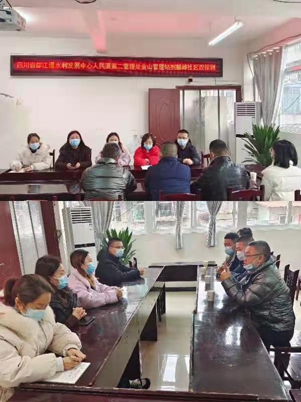 支部李兴刚书记向社区刘俊书记介绍了都江堰灌区一体化后金山站的相关情况,结合党员干部和青年职工的自身工作优势及专业特长和社区达成了服务承诺和志愿服务等共建活动。