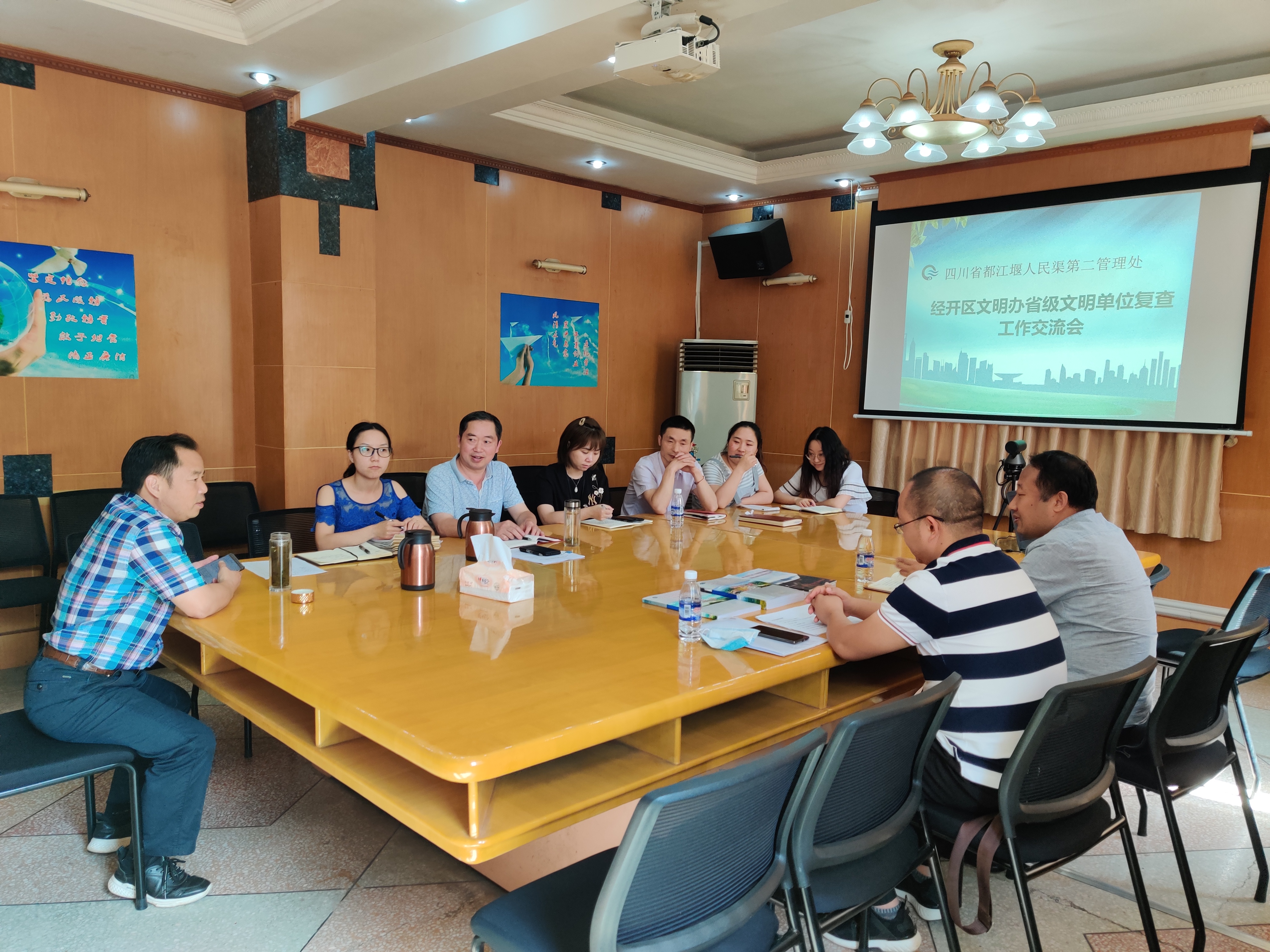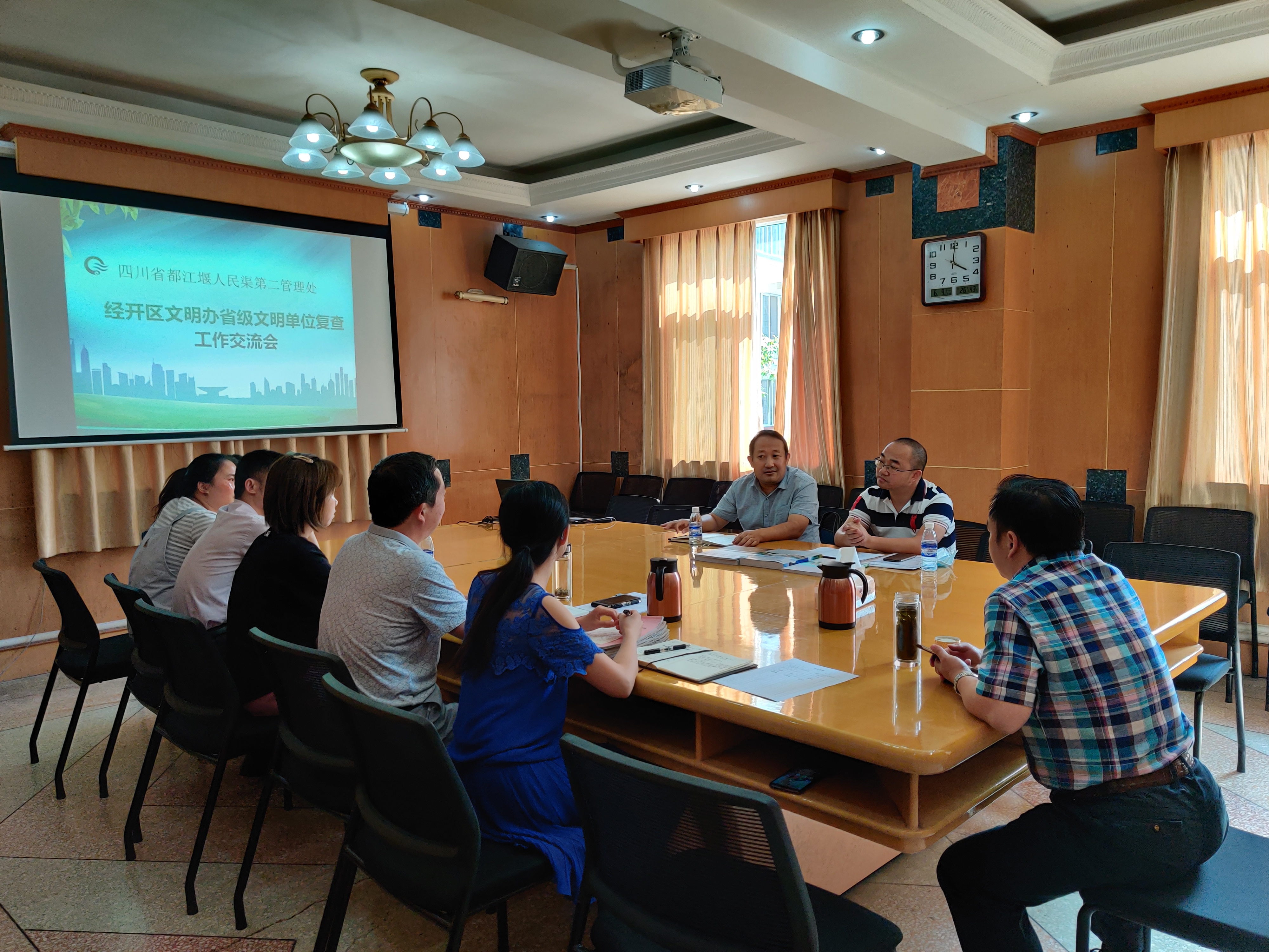 为进一步做好单位精神文明工作,6月10日,德阳市经开区文明办科长吕高峰及吴军到人民渠二处指导省级文明单位建设工作,人民渠二处工会主席邓顺杰、党办、办公室、工会、团委等相关人员参加座谈会。