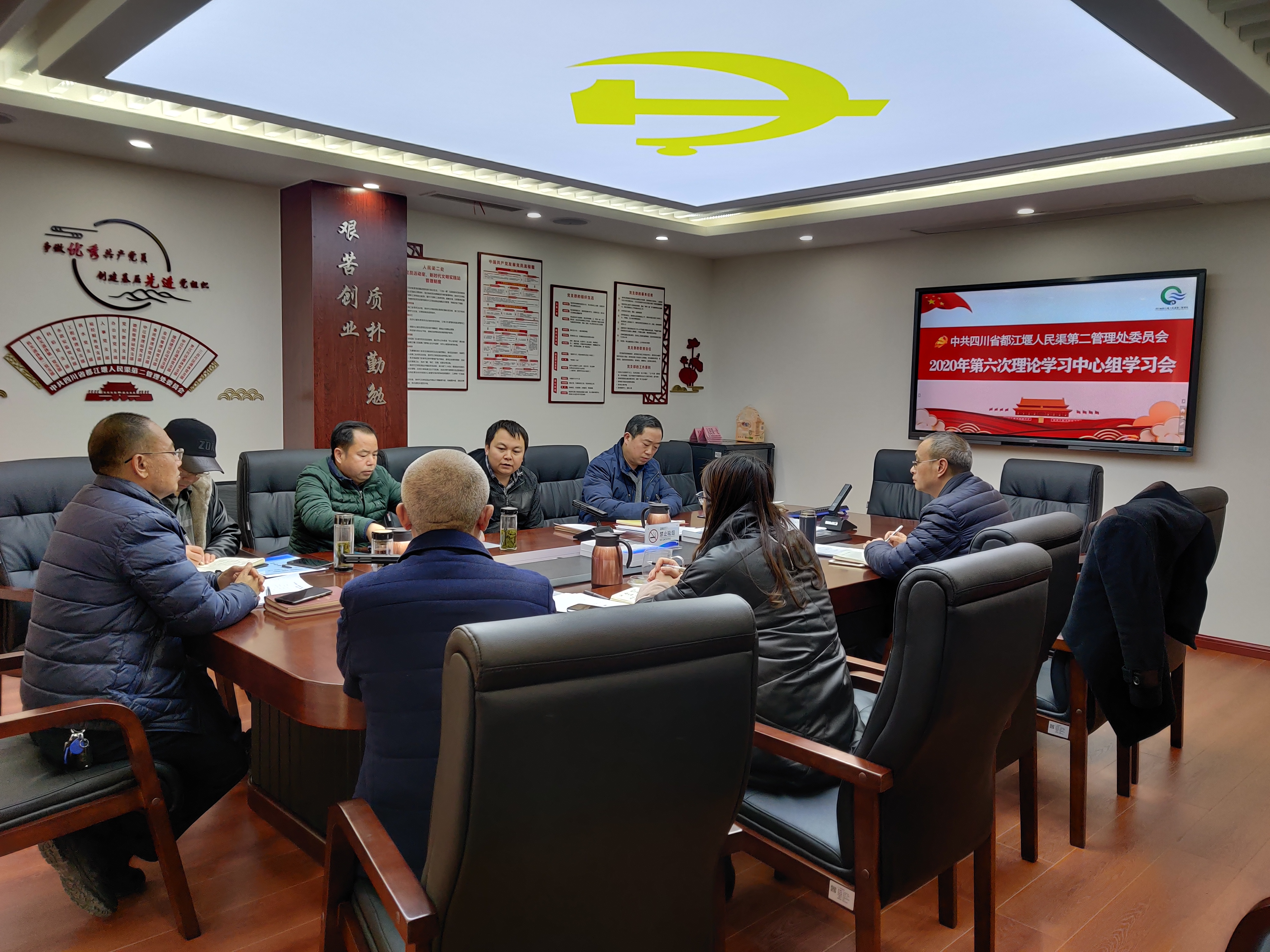 为深入学习领会党的十九届五中全会的重大意义和精神实质,积极推动学习型机关建设,四川省都江堰人民渠第二管理处于12月7日召开了2020年理论学习中心组第六次学习会。会议由处党委书记曾理主持,处党委委员、处级领导参加会议。