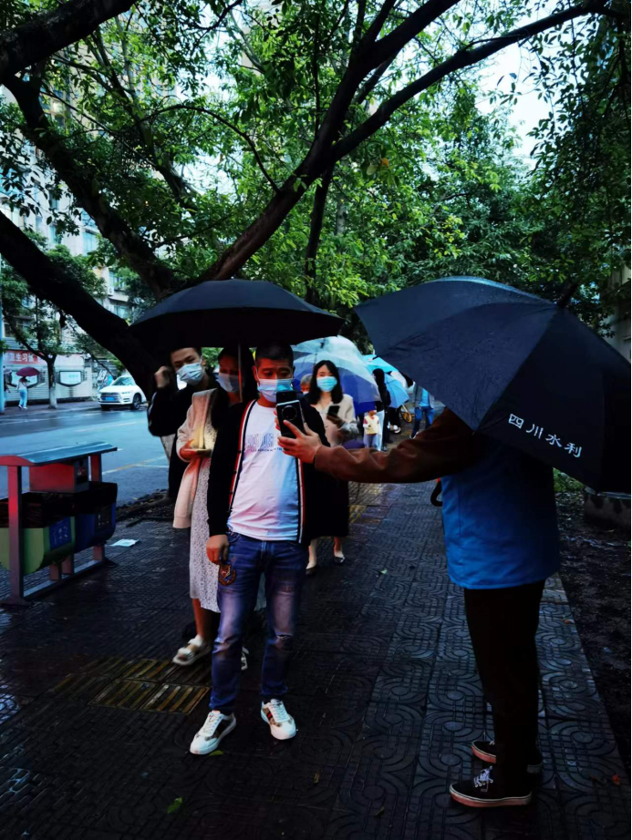 “请大家戴好口罩,扫场所码。”“请大家保持一米距离,有序排队。”“请大家亮完场所码,返回健康码。”“阿姨,扫我手机上的场所码吧。”“大爷,我帮您操作吧!”“请大家不要急,按顺序排好队”“请走出口撤离……”核酸检测现场,志愿者温馨提示的声音此起彼伏,身着人民渠二处水利行业志愿者蓝背心的志愿者们穿梭在长长的检测人群中,在雨水和夜幕下,这纯净的蓝背心和胸前的党员徽章格外耀眼,雨水湿了衣衫和头发,他们无惧无悔,毅然坚守在抗疫岗位。