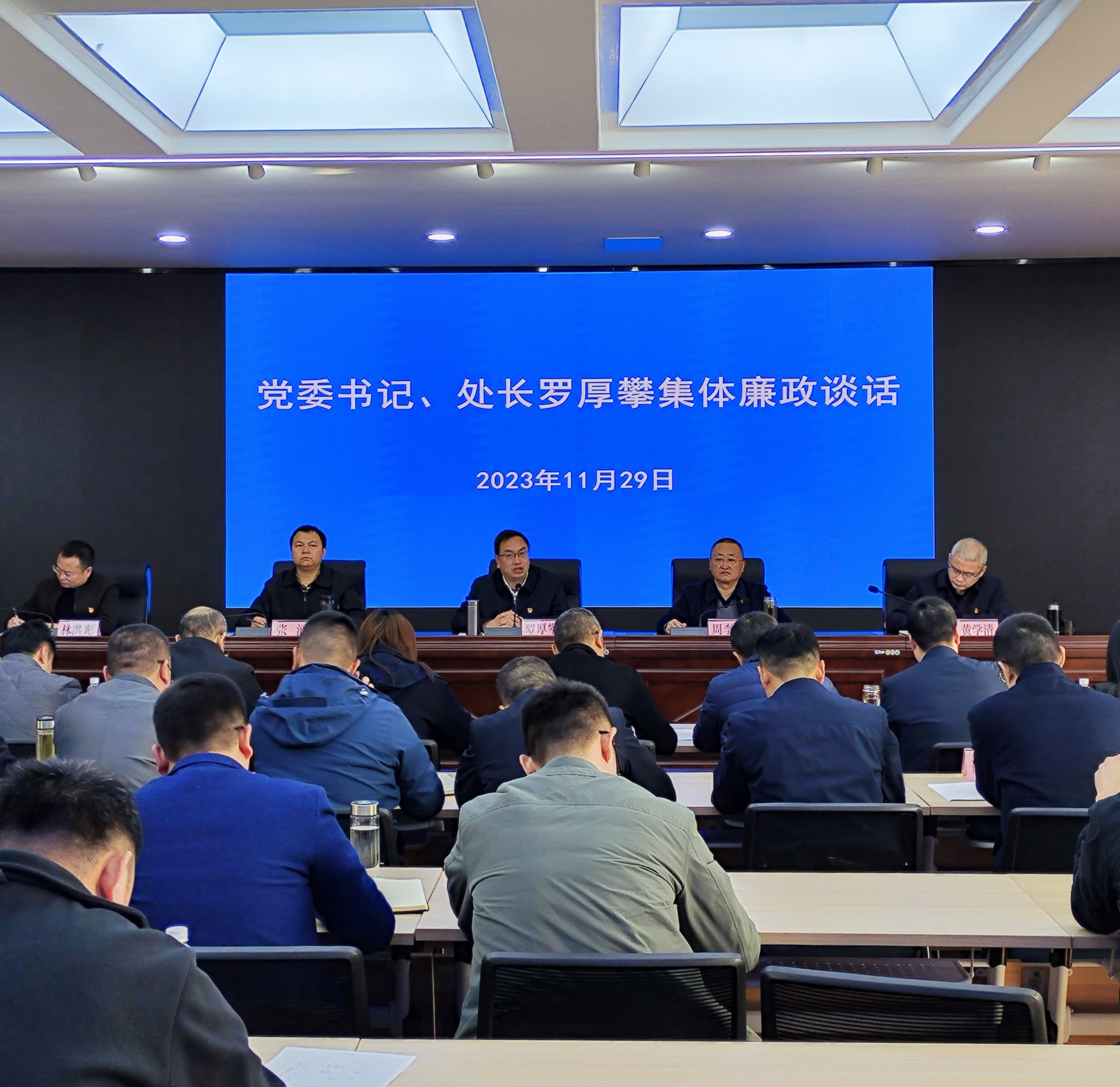 案例直击心弦,法槌敲响警钟。罗厚攀向与会中层干部进行了集体谈话,他要求:一是坚定政治方向,在把握大势中知责。要有坚定地政治方向和人生信仰,永葆对法纪的敬畏心,严格遵守单位规章制度、认真履职。二是突出重点,在真抓实干中担责。摒弃“躺平”思想,找准人生方向,务必发扬斗争精神,敢于斗争、善于斗争,凝心聚力推动单位高质量发展。三是严于律己,在带头表率中履职。要管好用好权力、严守纪法、做好表率,始终做到对党忠诚,廉洁自律,积极锚定灌区骨干水网建设、水权水价改革、防汛保供、瘦身增效、水利公益诉讼、创先争优等重点工作,团结带领全处干部职工开创水利工作发展新局面。