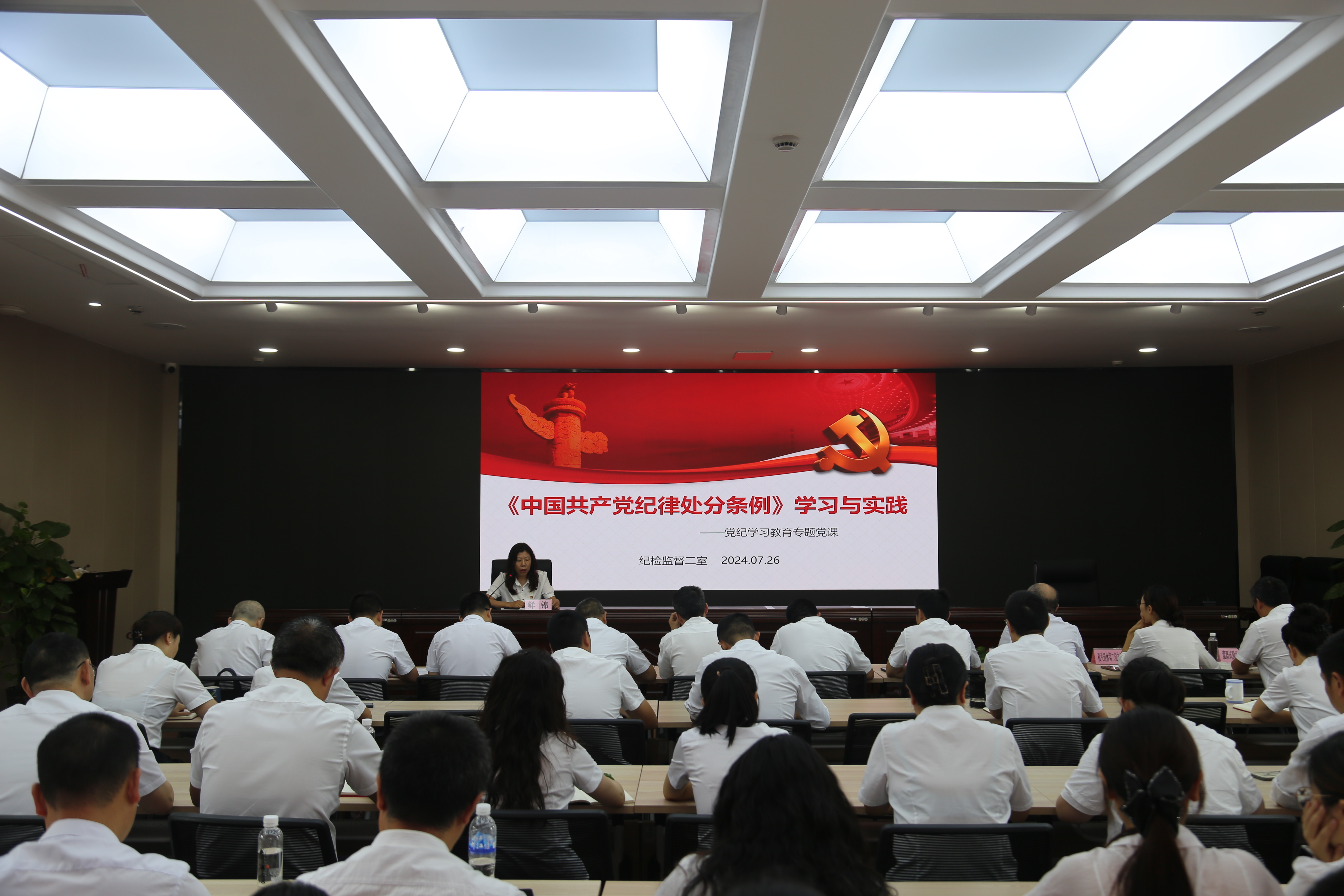 会上,纪检监督二室二办纪检专员鲜锦领学宣讲党纪党规,她以“《中国共产党纪律处分条例》学习与实践”为题,从《条例》修订沿革与主旨要义、基础知识与实践应用、落实廉洁自律有关规定和认清形势防微杜渐四个方面,深入浅出地作党纪学习教育专题党课分享,教育引导大家要学纪、知纪、明纪、守纪。