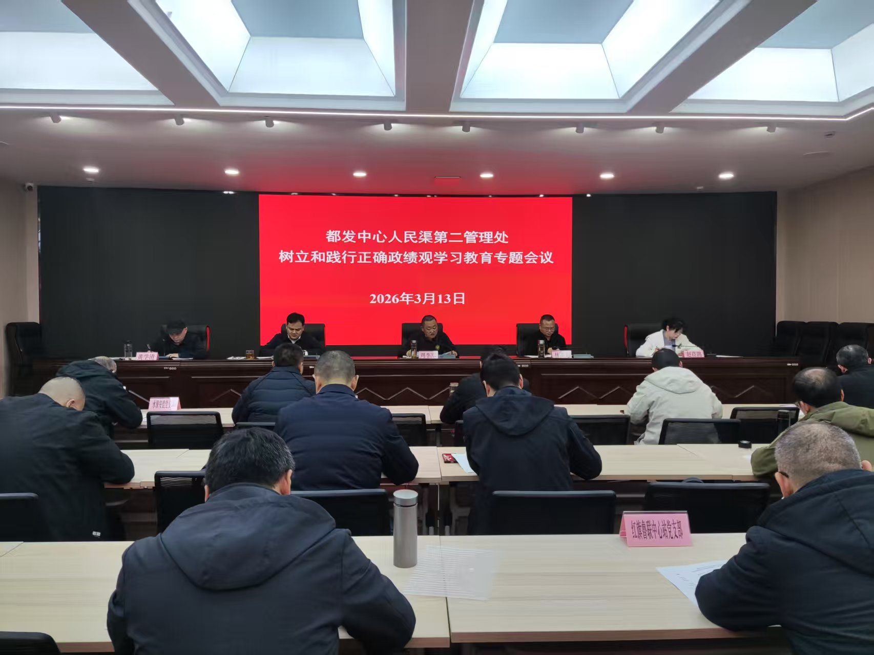 2026年3月13日,人民渠第二管理处召开树立和践行正确政绩观学习教育专题会议,学习习近平总书记关于树立和践行正确政绩观相关论述,传达《中共中央办公厅关于在全党开展树立和践行正确政绩观学习教育的通知》精神和中央党的建设工作领导小组、省委党建领导小组、水利厅党组、都发中心党委会议精神。会议由处党委书记、处长周李军主持,在家党委委员、都发中心纪委专职副书记、各党支部书记、各科站负责人参加。