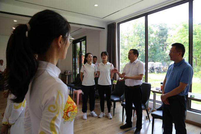 四川省第十四届运动会开幕在即,8月3日,都发中心党委书记、主任朱泽华陪同省直机关工委副书记唐功江、四川省消防救援总队政治部主任钟廷渊看望都发中心、四川省消防救援总队备战省运会的参赛队员并送上慰问品。