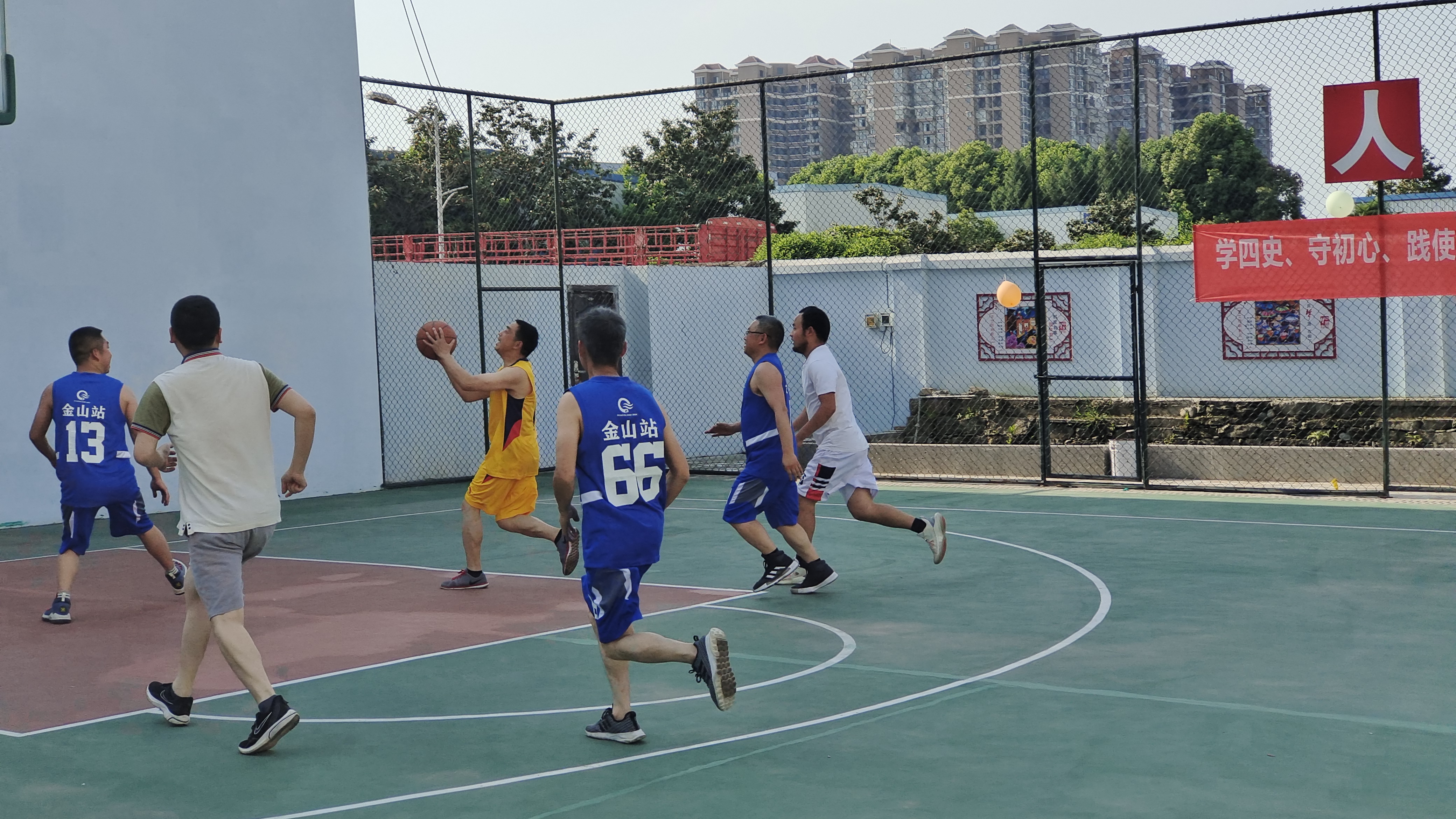 本次比赛由金山站职工队与灌区水利单位职工队进行,金山站李兴刚站长参赛并为球赛开球,赛场上,双方比分一直处于交替上升状况,战火愈演愈烈,在比赛时,双方抢球,断球,防守,进攻,严守应对,默契传球,完美配合,烈日下汗水早已湿透了球员们的衣裳,但球的场上的队员们却没有丝毫的松懈,生怕一个疏忽就让对方夺得了先机!现场金山站啦啦队员,为每一位在球场上全力拼搏的选手加油鼓劲,将赛场气氛推向高潮。