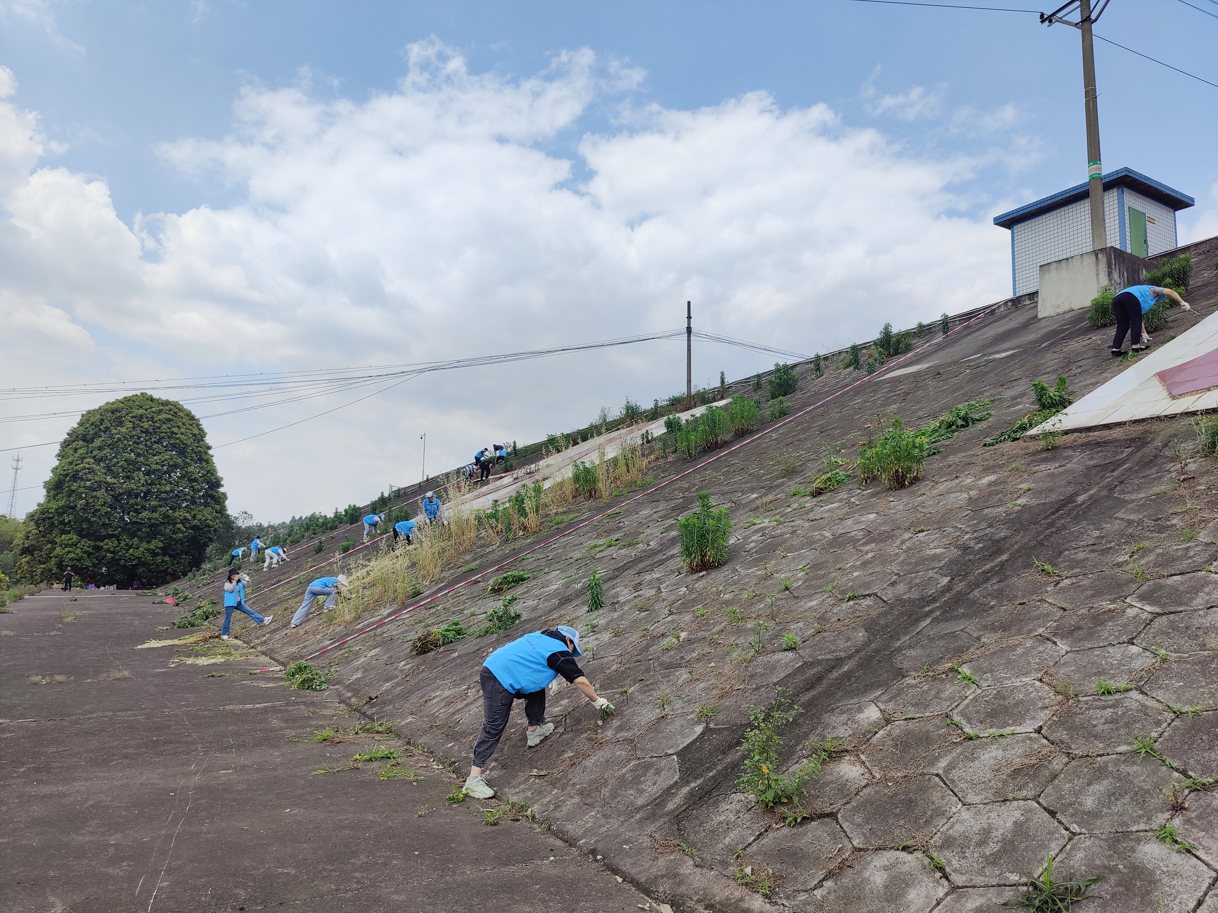 下午,都发中心人民渠二处在谭家坝渡槽组织开展健步走活动。谭家坝渡槽横跨成绵乐高铁和宝成铁路,构造雄伟,是人民渠六期干渠上极具标志性的水工建筑物。青年们在健步走中了解水利工程运行及水利保护现状,迎面灼热的阳光,清理渡槽坡面垃圾、杂草,助力建设“河畅、水清、岸绿、景美”的人民渠样板。