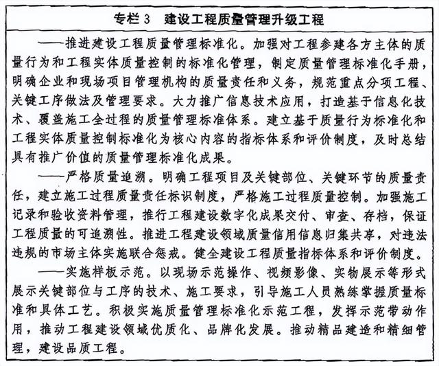 (十五)打造中国建造升级版。坚持百年大计、质量第一,树立全生命周期建设发展理念,构建现代工程建设质量管理体系,打造中国建造品牌。完善勘察、设计、监理、造价等工程咨询服务技术标准,鼓励发展全过程工程咨询和专业化服务。完善工程设计方案审查论证机制,突出地域特征、民族特点、时代风貌,提供质量优良、安全耐久、环境协调、社会认可的工程设计产品。加大先进建造技术前瞻性研究力度和研发投入,加快建筑信息模型等数字化技术研发和集成应用,创新开展工程建设工法研发、评审、推广。加强先进质量管理模式和方法高水平应用,打造品质工程标杆。推广先进建造设备和智能建造方式,提升建设工程的质量和安全性能。大力发展绿色建筑,深入推进可再生能源、资源建筑应用,实现工程建设全过程低碳环保、节能减排。