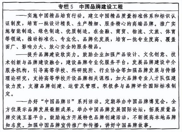 ——品牌建设取得更大进展。品牌培育、发展、壮大的促进机制和支持制度更加健全,品牌建设水平显著提高,企业争创品牌、大众信赖品牌的社会氛围更加浓厚,品质卓越、特色鲜明的品牌领军企业持续涌现,形成一大批质量过硬、优势明显的中国品牌。