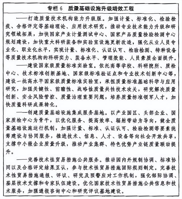 (二十三)加强质量基础设施能力建设。合理布局国家、区域、产业质量技术服务机构,建设系统完备、结构优化、高效实用的质量基础设施。实施质量基础设施能力提升行动,突破量子化计量及扁平化量值传递关键技术,构建标准数字化平台,发展新型标准化服务工具和模式,加强检验检测技术与装备研发,加快认证认可技术研究由单一要素向系统性、集成化方向发展。加快建设国家级质量标准实验室,开展先进质量标准、检验检测方法、高端计量仪器、检验检测设备设施的研制验证。完善检验检测认证行业品牌培育、发展、保护机制,推动形成检验检测认证知名品牌。加大质量基础设施能力建设,逐步增加计量检定校准、标准研制与实施、检验检测认证等无形资产投资,鼓励社会各方共同参与质量基础设施建设。