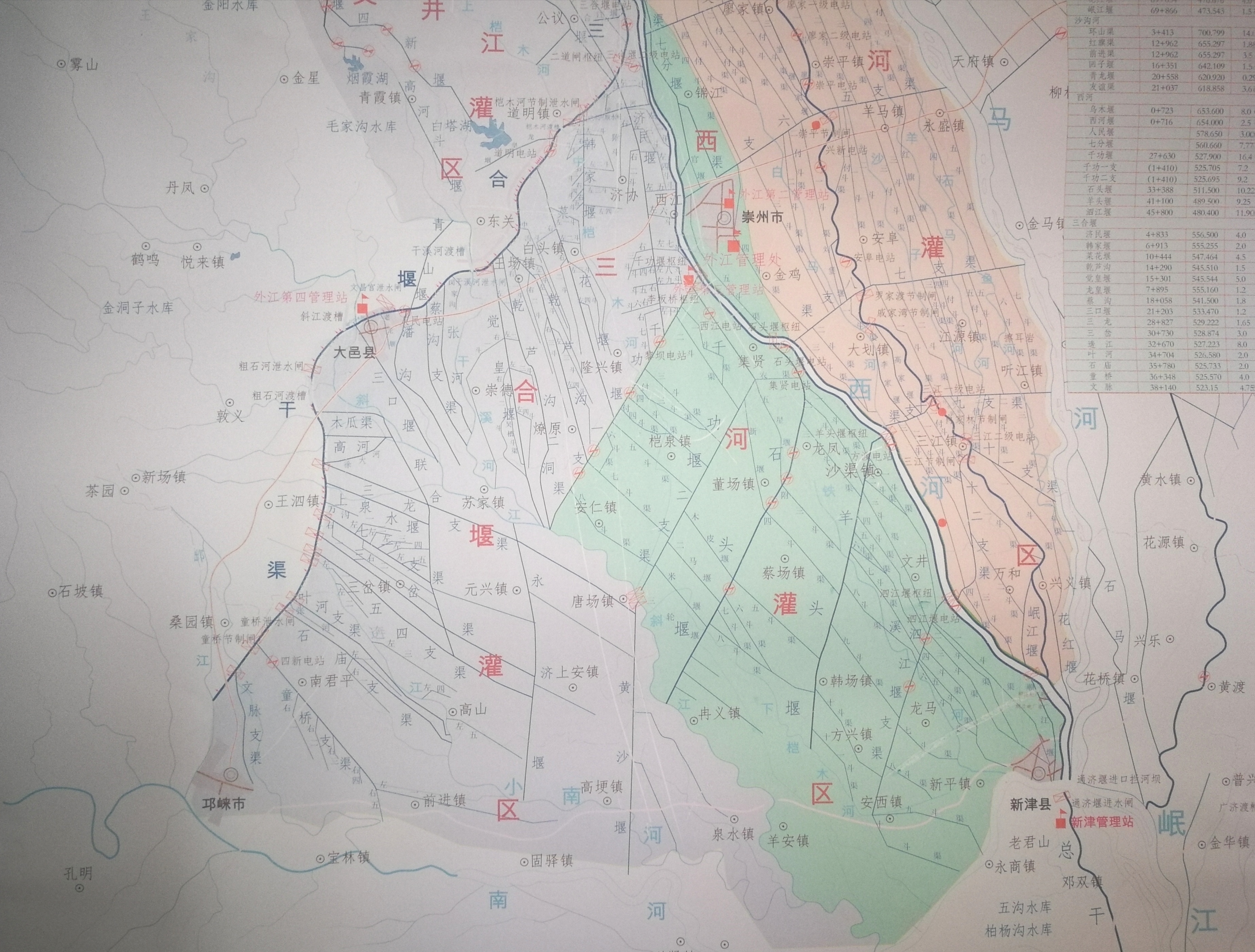 断流影响的支渠:大邑县的蔡沟、觉皇堰、奔江渠、木瓜渠、潘沟、七一渠、三岔渠、三口渠、三龙渠、五四渠、分水洞;崇州市的济民堰、韩家堰、菜花堰、前罗沟、龙皇堰;邛崃市的童桥堰、文脉堰。受影响的乡镇:大邑县的王泗、苏场、五龙、三岔、高山、元兴、银屏、斜江、敦义、安仁、城关等;崇州市的道明、济协、白头、王场、隆兴、燎原、东关等;邛崃市的前进、君平、拱辰、固驿、桑园、东安等。