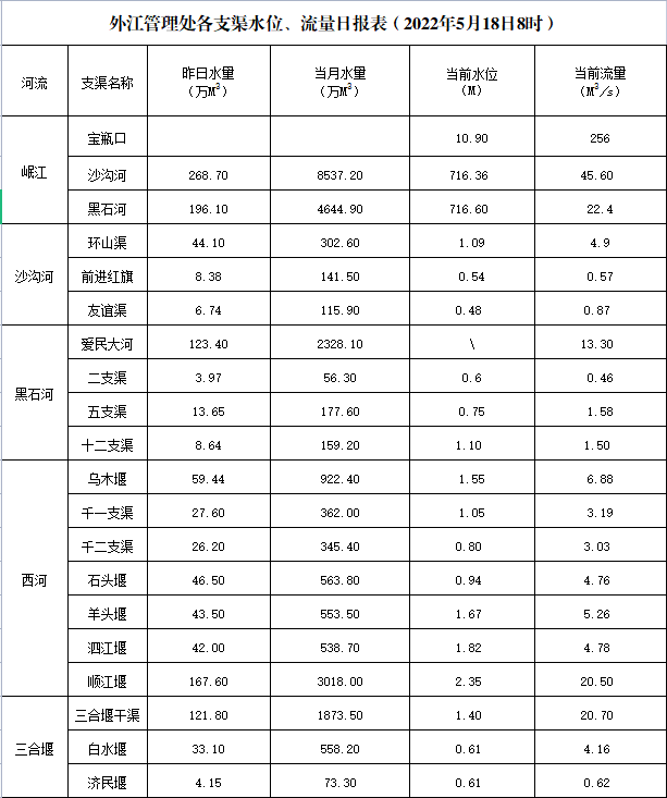 外江管理处各支渠水位、流量日报表(2022年5月18日8时)