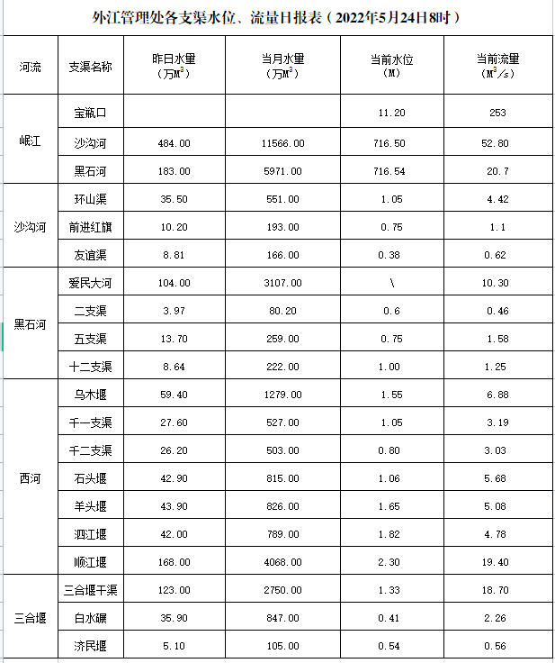 外江管理处各支渠水位、流量日报表(2022年5月24日8时)