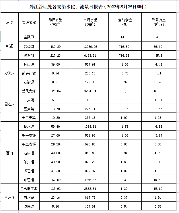 外江管理处各支渠水位、流量日报表(2022年5月25日8时)