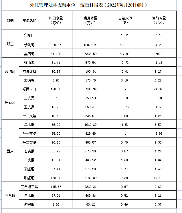 外江管理处各支渠水位、流量日报表(2022年6月20日8时)