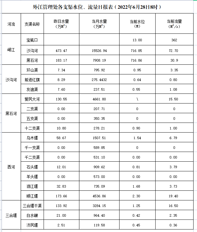 外江管理处各支渠水位、流量日报表(2022年6月28日8时)