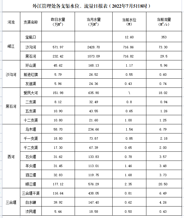 外江管理处各支渠水位、流量日报表(2022年7月5日8时)