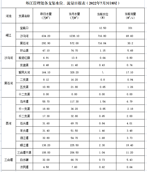 外江管理处各支渠水位、流量日报表(2022年7月3日8时)