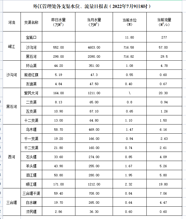 外江管理处各支渠水位、流量日报表(2022年7月9日8时)