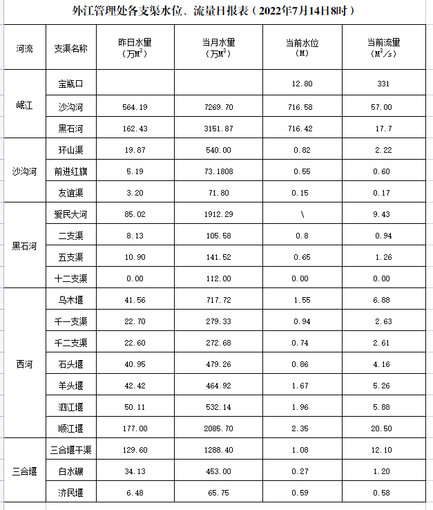 外江管理处各支渠水位、流量日报表(2022年7月14日8时)