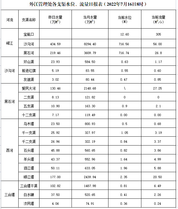 外江管理处各支渠水位、流量日报表(2022年7月16日8时)