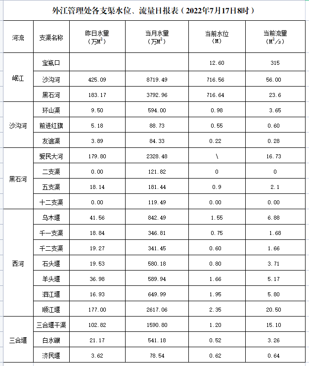 外江管理处各支渠水位、流量日报表(2022年7月17日8时)