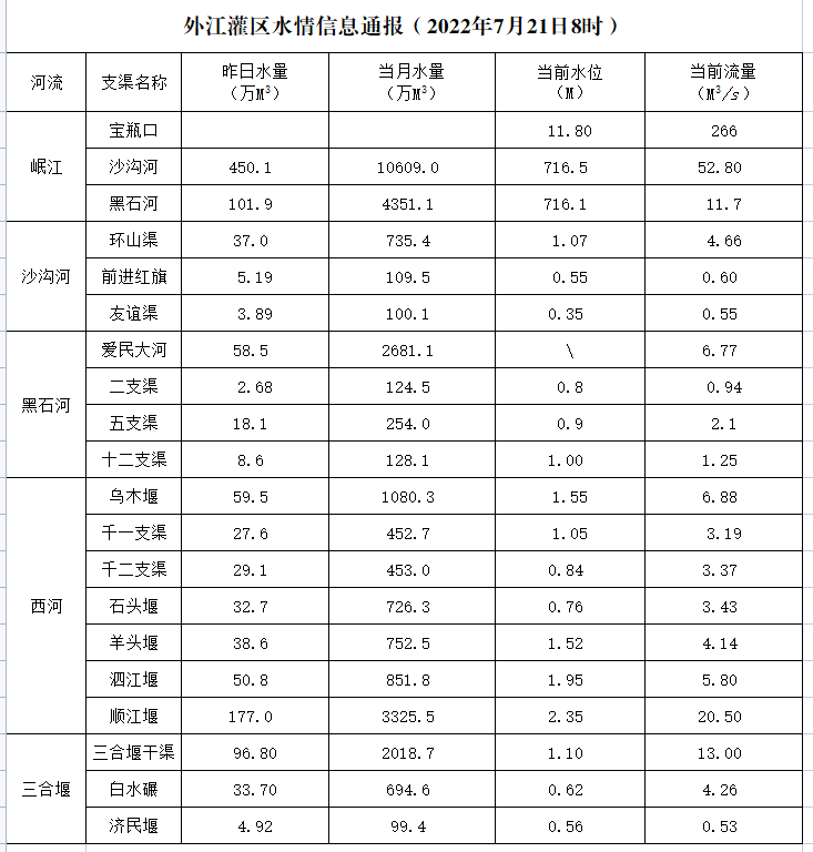 外江灌区水情信息通报(2022年7月21日8时)