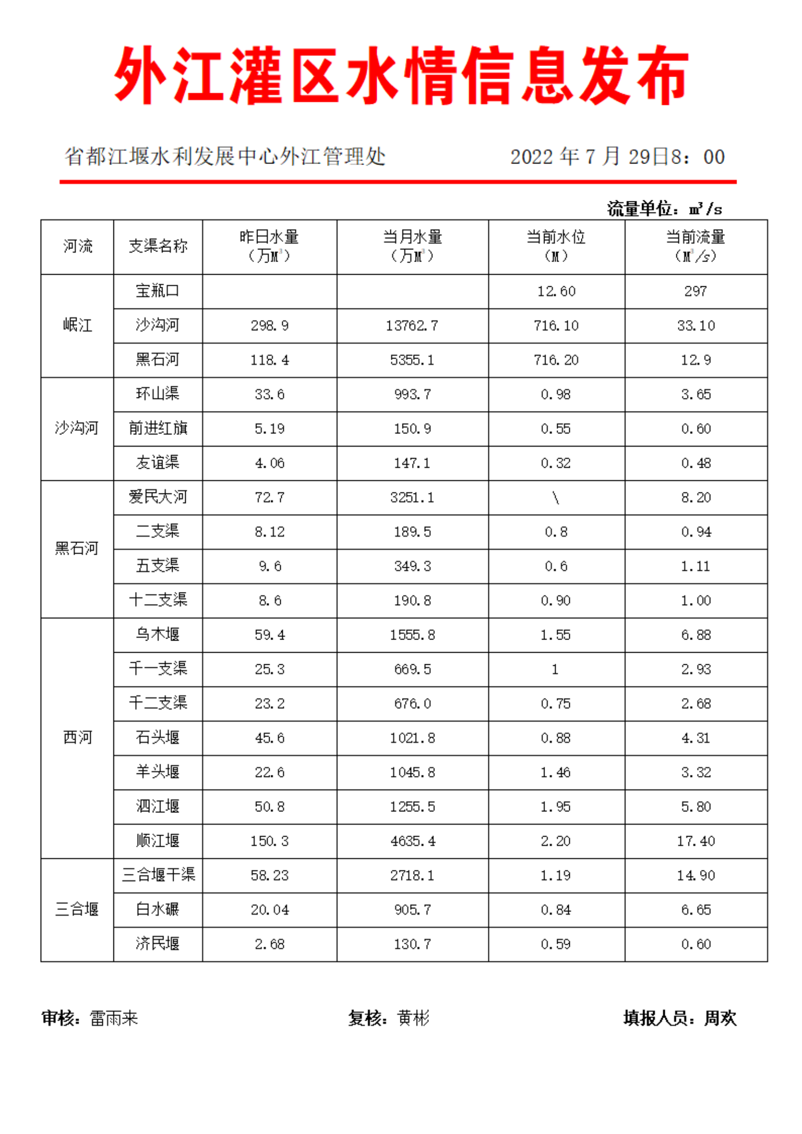 外江管理处各支渠水位、流量日报表(2022年7月29日8时)