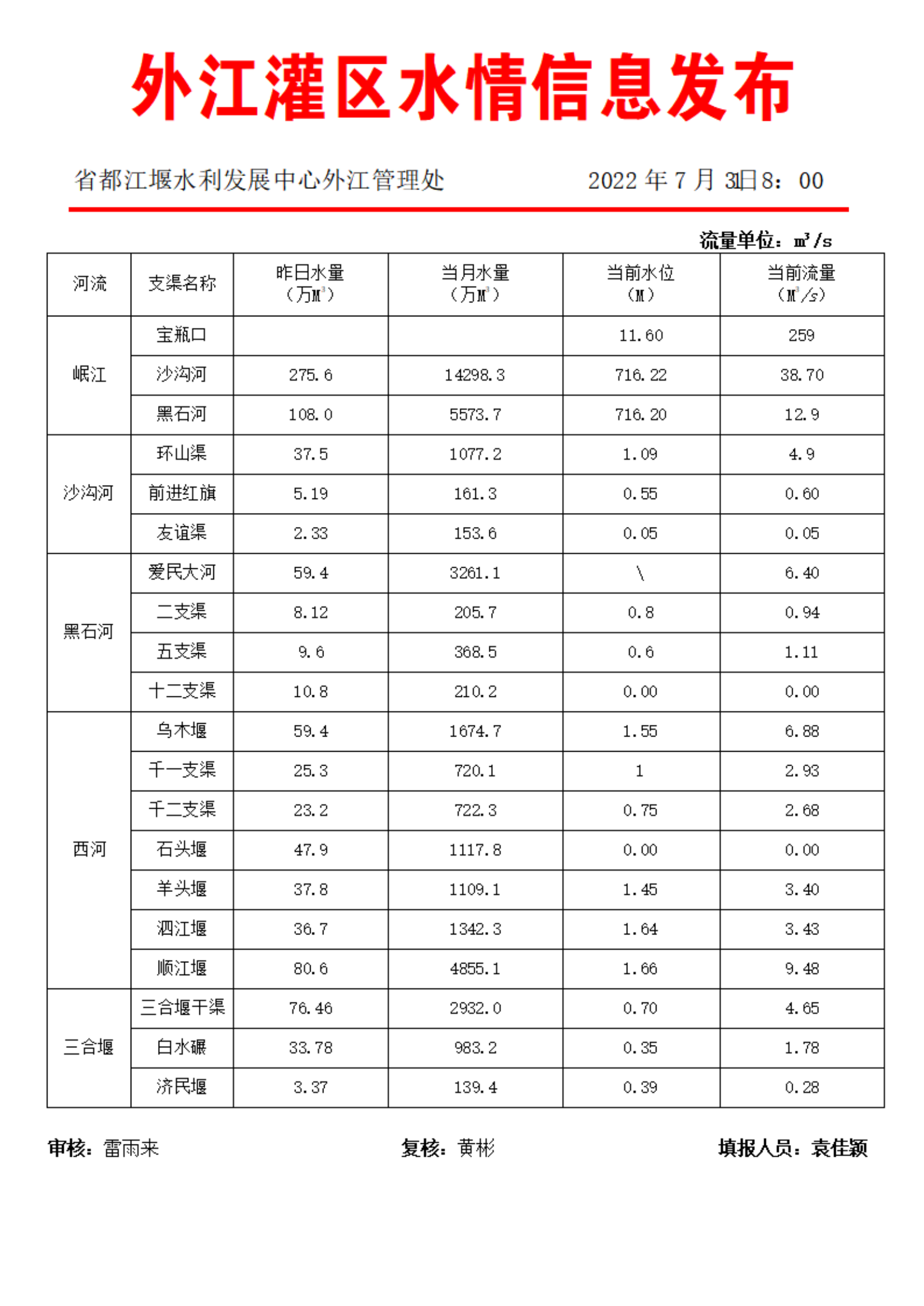 外江管理处各支渠水位、流量日报表(2022年7月31日8时)