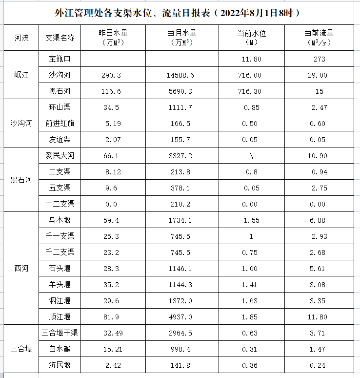 外江管理处各支渠水位、流量日报表(2022年8月1日8时)