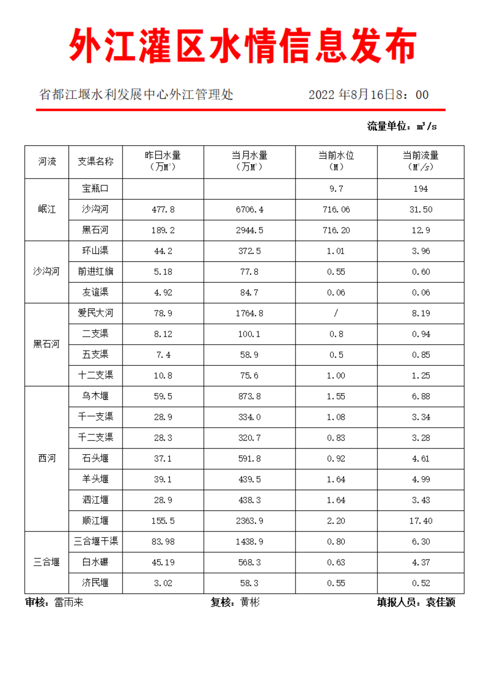 外江管理处各支渠水位、流量日报表(2022年8月16日8时)