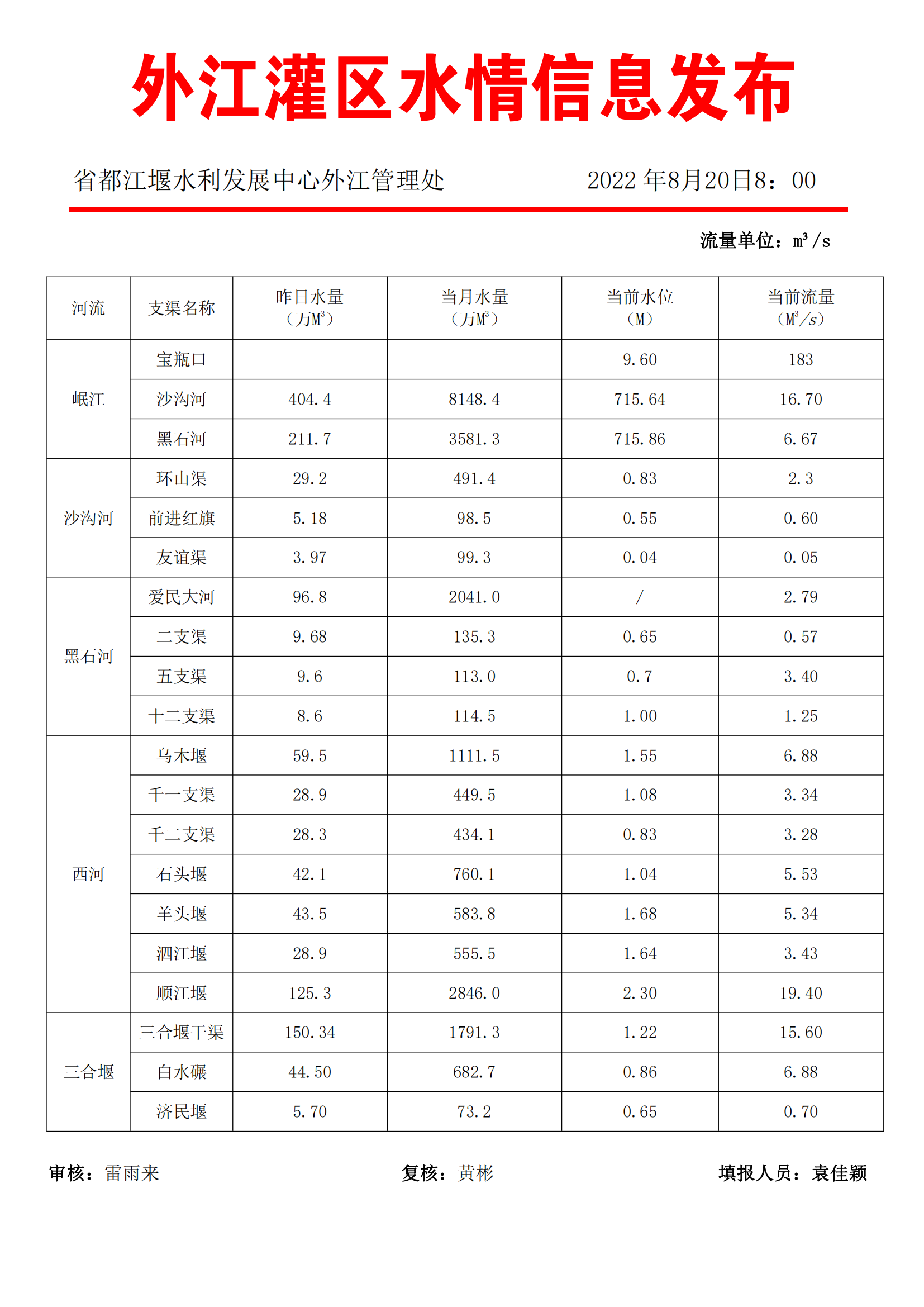 外江管理处各支渠水位、流量日报表(2022年8月20日8时)
