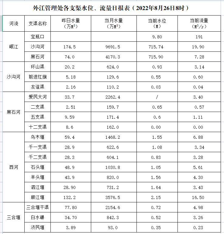 外江管理处各支渠水位、流量日报表(2022年8月26日8时)