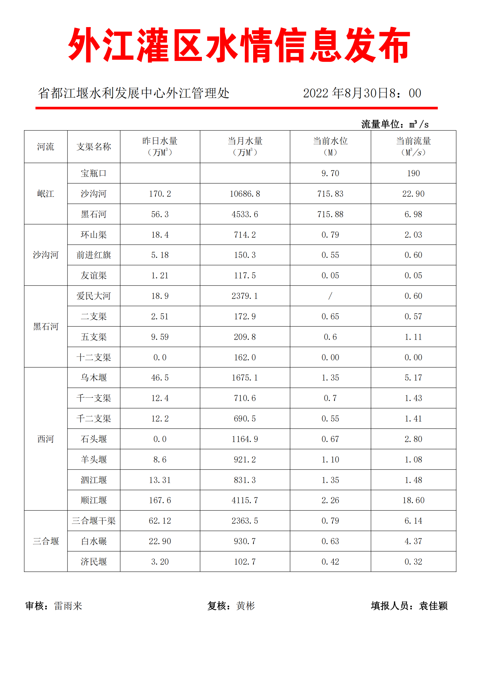 外江管理处各支渠水位、流量日报表(2022年8月30日8时)