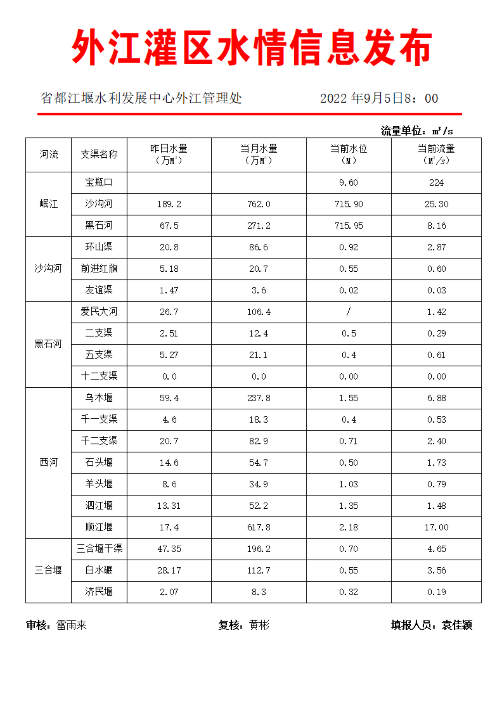外江管理处各支渠水位、流量日报表(2022年9月5日8时)