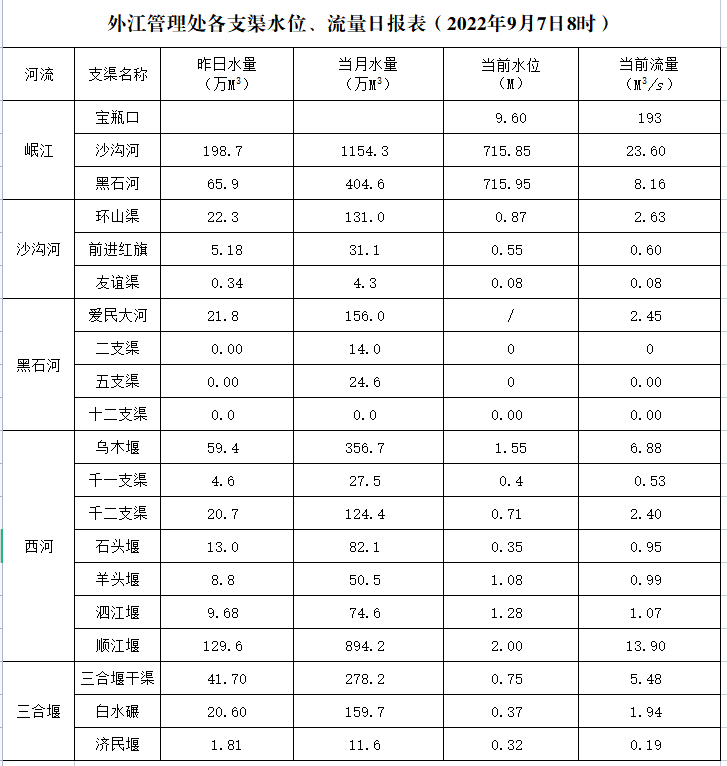 外江管理处各支渠水位、流量日报表(2022年9月7日8时)