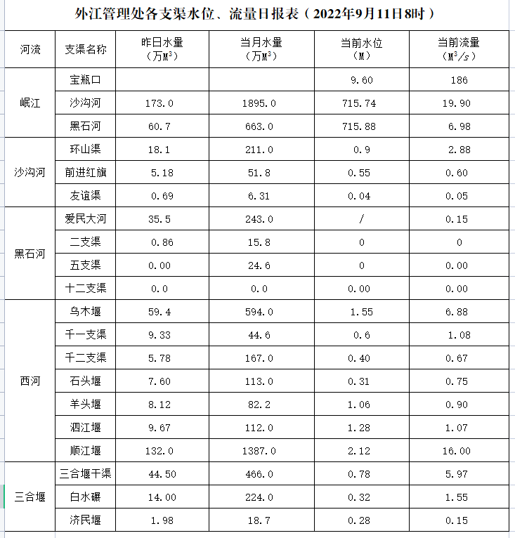 外江管理处各支渠水位、流量日报表(2022年9月11日8时)
