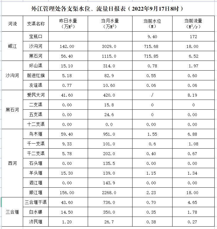 外江管理处各支渠水位、流量日报表(2022年9月17日8时)