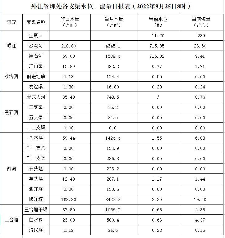外江管理处各支渠水位、流量日报表(2022年9月25日8时)