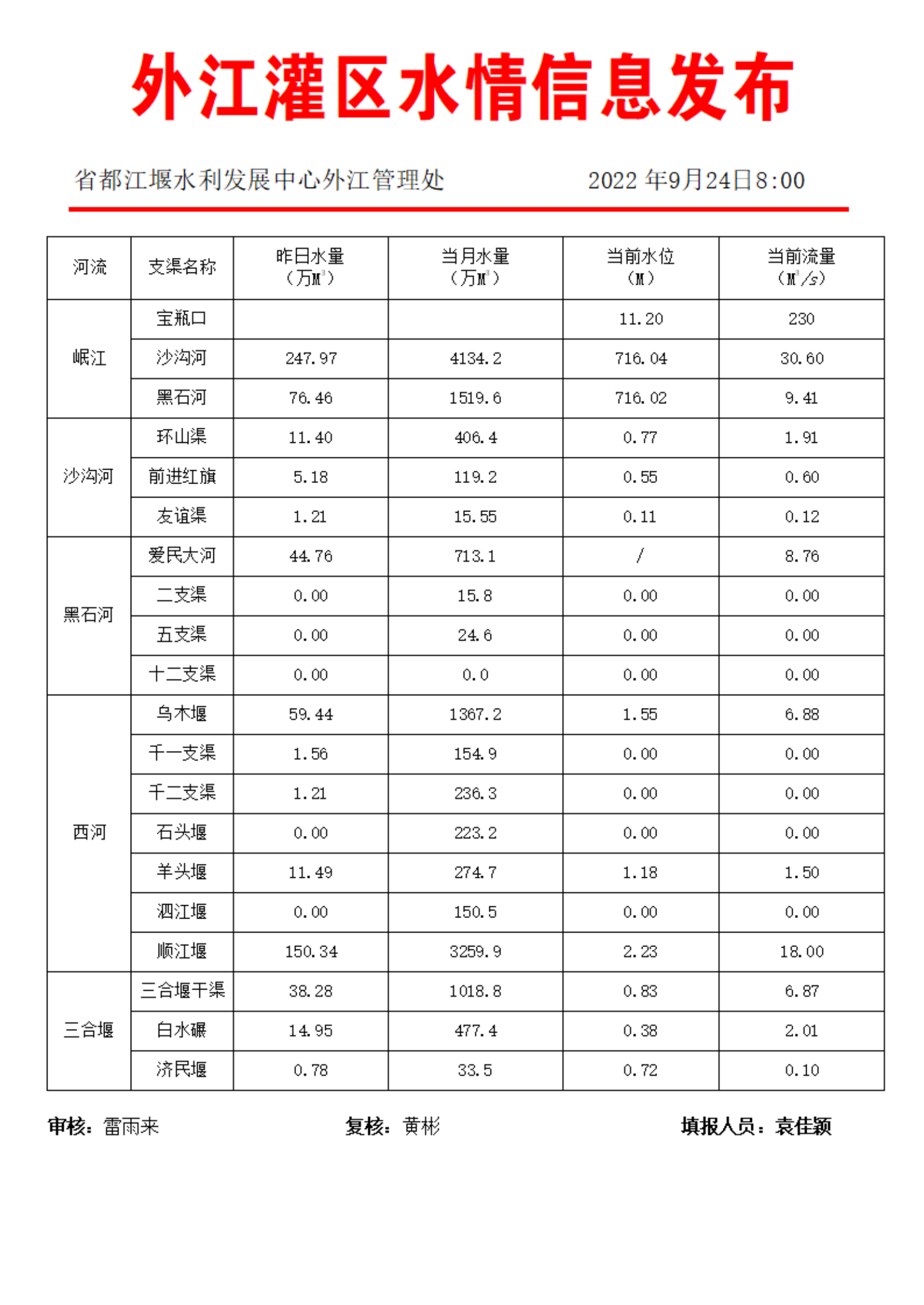 外江管理处各支渠水位、流量日报表(2022年9月23日8时)