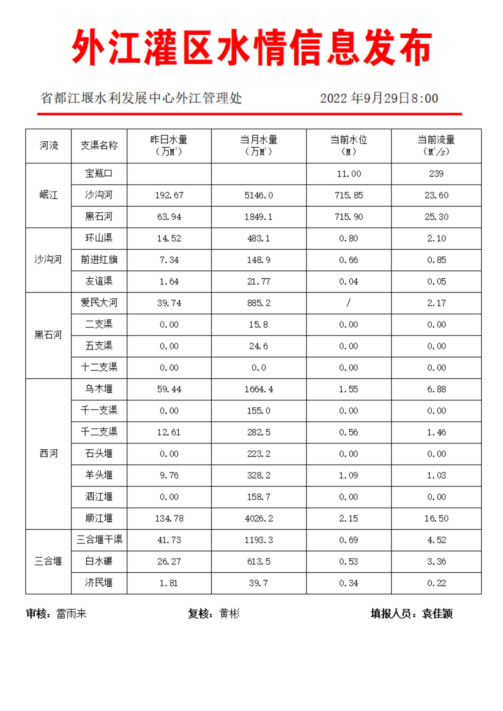 外江管理处各支渠水位、流量日报表(2022年9月29日8时)