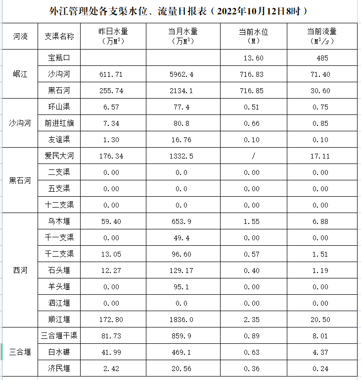 外江管理处各支渠水位、流量日报表(2022年10月12日8时)