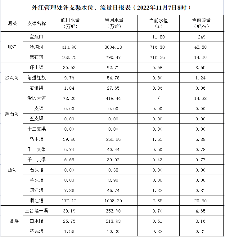 外江管理处各支渠水位、流量日报表(2022年11月7日8时)