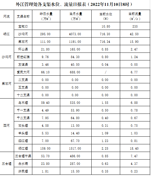 外江管理处各支渠水位、流量日报表(2022年11月10日)