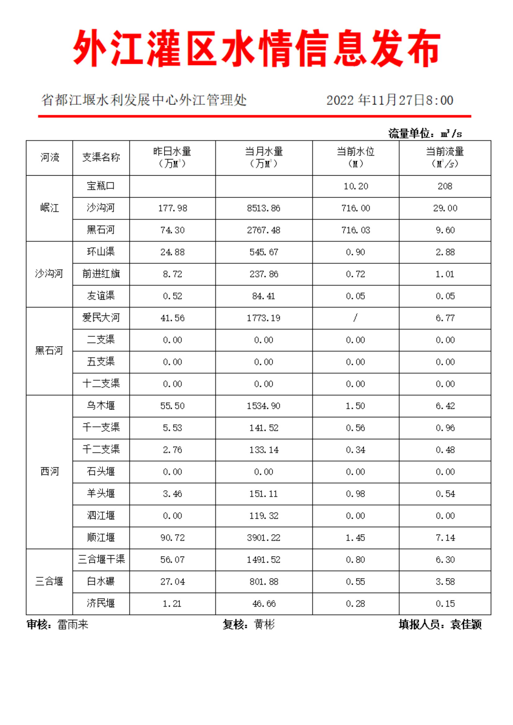 外江管理处各支渠水位、流量日报表(2022年11月27日8时)